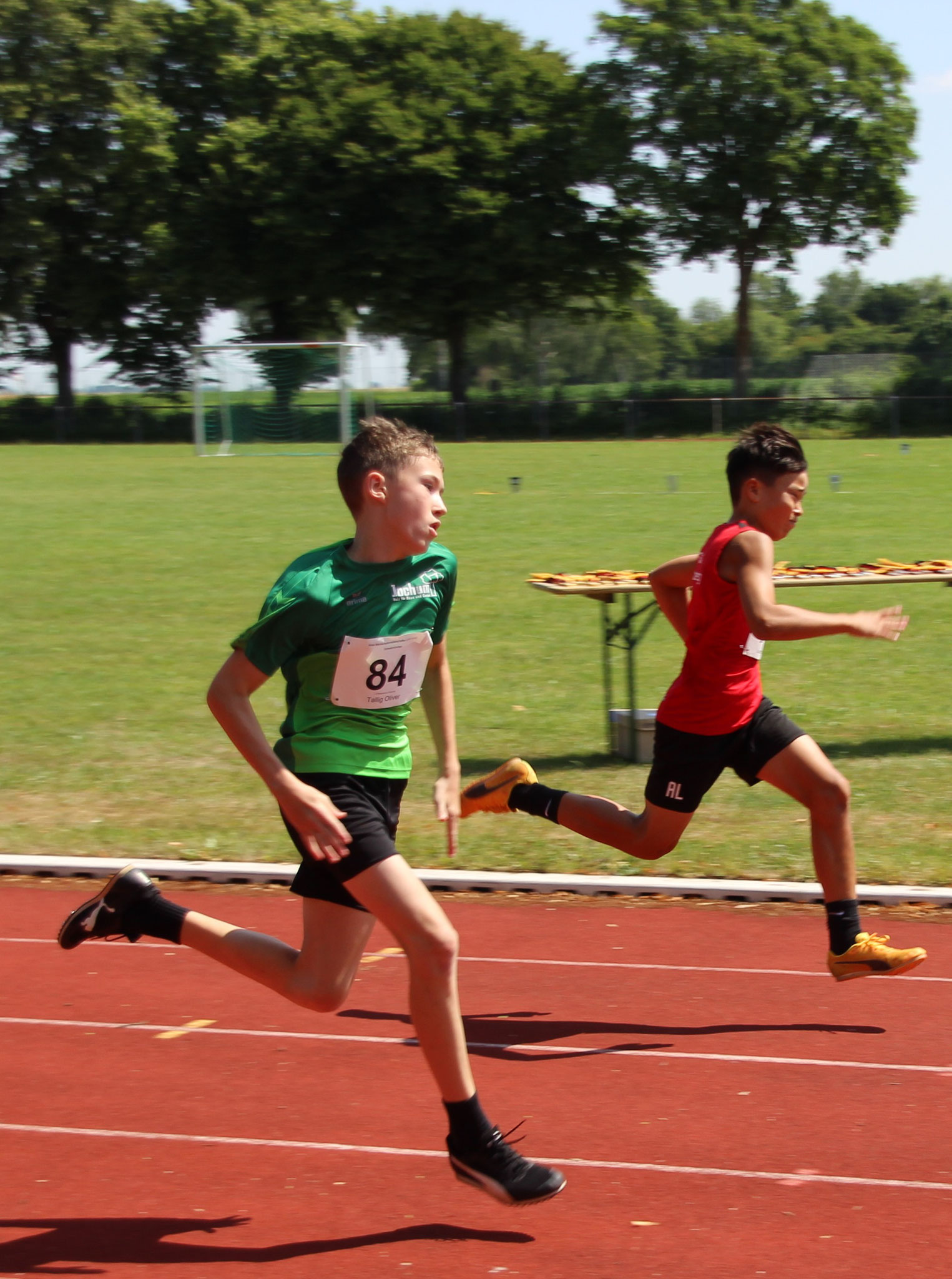20. Juli: Bei einem Wettkampf zuhause ist die Anspannung immer besonders groß. Wenn dann alles klappt, ist auch der Jubel besonders groß, weil Freunde und Verwandte mit den Kindern mitfiebern. Für die männliche U12 gingen bei strahlendem Sonnenschein Leonhard Höck, Marko Jarosch und Simon Rolle (alle M10) sowie Jakob Engel, Elias Kratzer und Elias Wiehler (alle M11) an den Start. Elias Kratzer erlief sich in einem flotten Rennen Rang 3 über 800 Meter und Jakob feierte mit außergewöhnlichen 4,15 m im Weitsprung und 7,74 sek im Sprint über 50 m gleich zwei Kreismeistertitel.