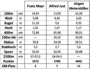 Jürgen Hinterstößer kann auch zufrieden sein: Mit 16,91 sek über 100m, 10,45m im Kugelstoßen (5kg) und 3,33m im Weitsprung erreichte er 1436 Punkte und Rang 4 der Meisterschaft.