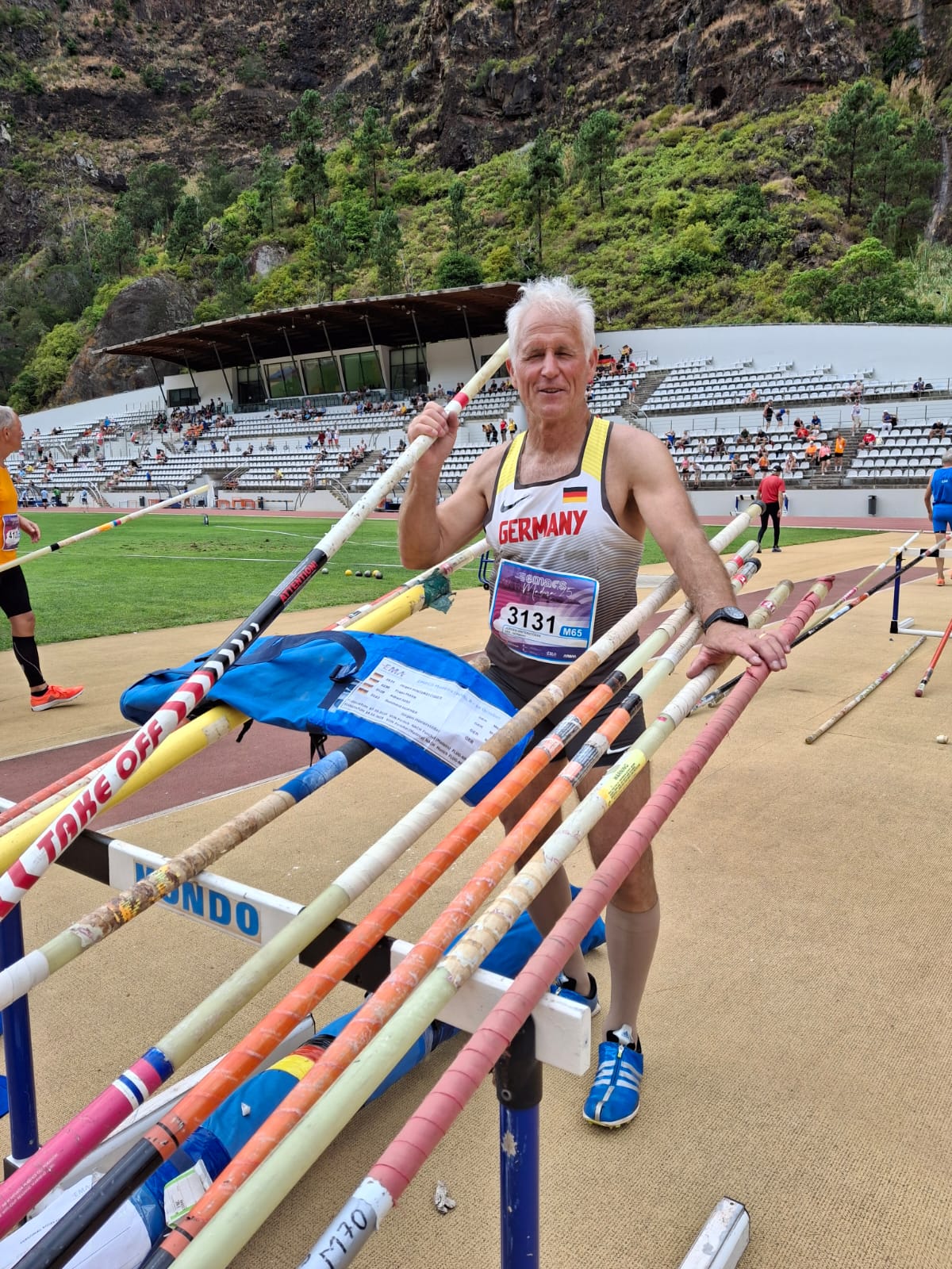 Zwei Tage nach dem Zehnkampf starteten Franz Mayr und Jürgen Hinterstößer beim Stabhochsprung. Und hier gelang dem 70 jährigen Franz, obwohl er diese Spezialdisziplin erst wieder dieses Jahr trainiert hatte, ein hervorragender fünfter Platz mit übersprungenen 2,75m. Jürgen Hinterstößer, seit Jahren der Stabhochsprung-Pabst in Schwaben, wiederholte sein Sprungergebnis des Zehnkampfes: 2,60m bedeuteten Rang neun im starken Teilnehmerfeld der 65 jährigen Männer. (MS). Ergebnisse>>